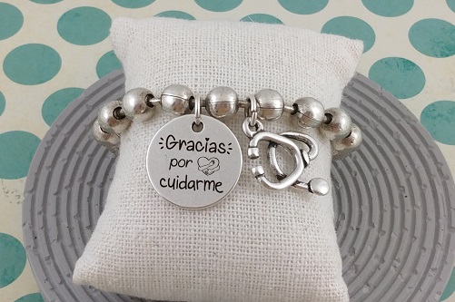 Piezas: Cadenas bolas grande - Cierre cadena bolas grande - Chapa zamak 22 mm. (personalizable con nuestro servicio de grabado) - Charm estetoscopio - 2 anillas 8 mm.