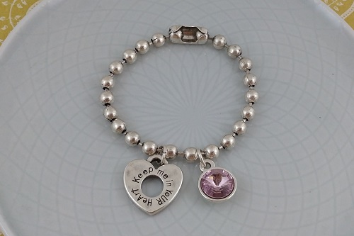 Piezas: Cadenas bolas mediana - Cierre cadena de bolas mediana - Colgante con rívoli 12 mm. light amethist (elige color en el enlace) - Colgante corazón "keep me in your heart" - 2 anillas de 8 mm.