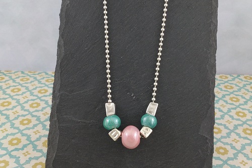 Piezas: Cadenas bolas mini (NOVEDAD) - Cierre cadena bolas mini - Pasador tubo irregular de 8 mm. - Pasador irregular 7 x 6 mm. - 2 Bola cerámica verde mint 8 mm. - 1 bola cerámica rosa bebé 12 mm