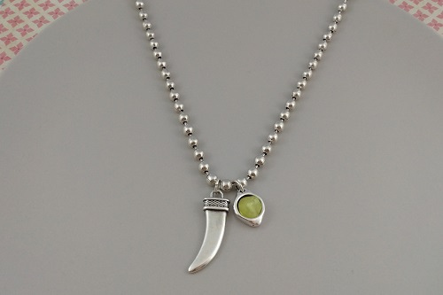 Piezas: Cadenas bolas pequeña - Cierre cadena bolas pequeña - Colgante cuerno - Colgante con cabujón 11 mm. pistacho (en el enlace puedes elegir color) - 2 anillas 8 mm.