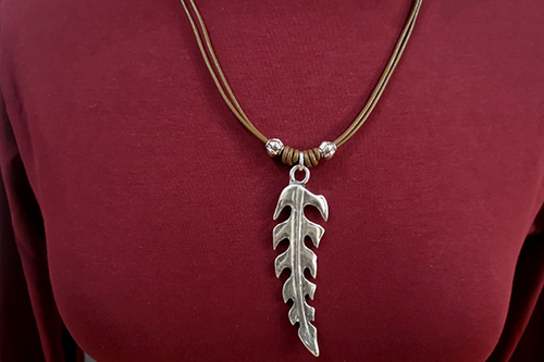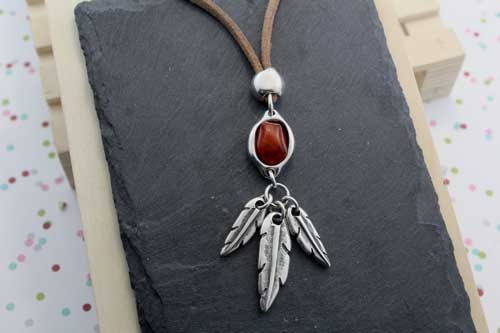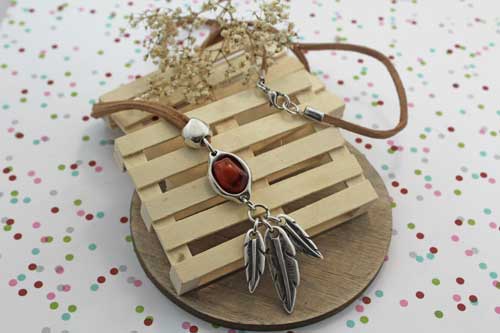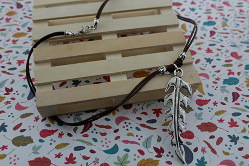 Abalorios: Colgante zamak hoja de 70 mm , cuero 2 mm ( 1 metro y 20 cms) , 2 terminales redondos 3,5 mm , 1 anilla 6 mm , 1 anilla 8 mm , mosquetón de 12 mm , anilla ovalada 9 x 6 mm y 2 bolas étnica de 8 mm con taladro de 3 mm.