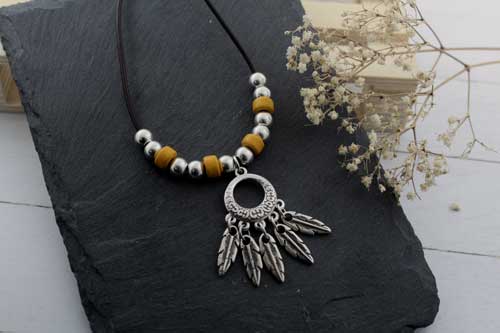 Abalorios: cuero de 2 mm, 10 bolas de 6 con taladro 2,4 mm , 4 disco de cerámica 8 mm taladro 2,5 mm , 5 colgantes hoja de zamak de 15 mm 5 anillas 6 mm , colgante étnico con anillas y terminal mosquetón de 2 mm.