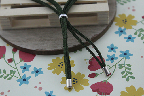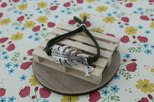 Abalorios: antelina 3 mm (unos 57-60 cms) , entrepieza zamak hoja con doble anilla , charm letra P , anilla 6 mm , anilla mediana cerrada y 2 Terminales tubo de zamak bañado en plata de 4 mm y taladro de 3,2 mm.