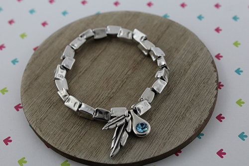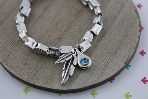 Abalorios: hilo de silicona de 0,8 mm (unos 30 cm) , colgante hoja de zamak 20 mm , colgante hoja de zamak de 15 mm , colgante gota con Swarovski SS24 , 1 anilla 6 mm y 22 cubos de zamak irregulares 7 x 6 mm.