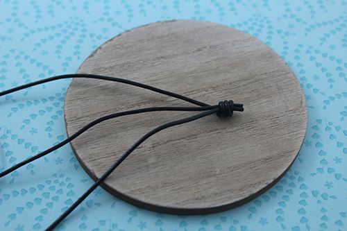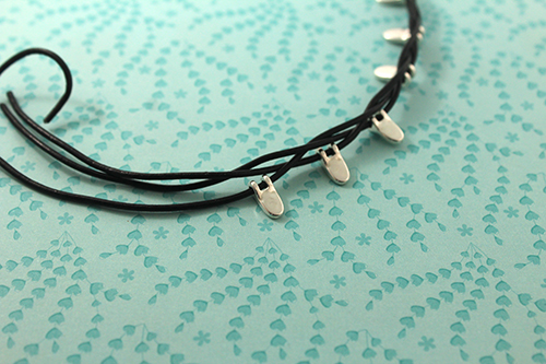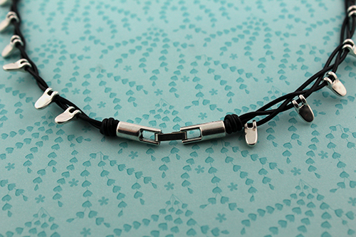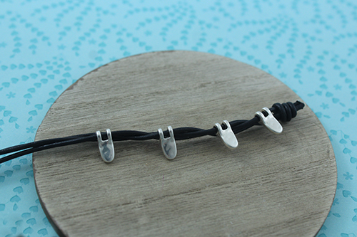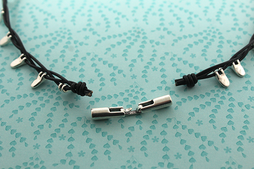 Una vez que hayas acabado, realiza otro nudo simple para cerrar el collar. Corta los cueros a la misma altura. Pega el cierre fleje de 3 mm con el pegamento hasulith.