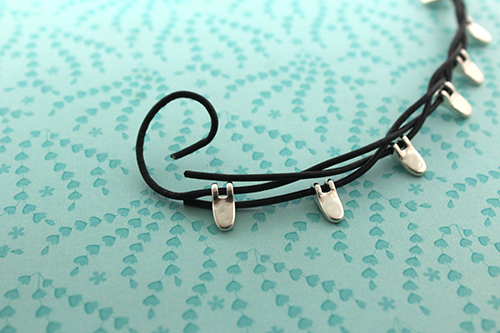 Coloca siempre la entrepieza diente en el cordón que quede más en el exterior del collar. Como te decíamos, puedes dejar más o menos apretada la trenza según te guste. Nosotros hemos preferido dejarlo algo más suelto y utilizar 25 entrepiezas.