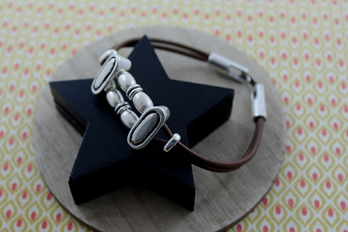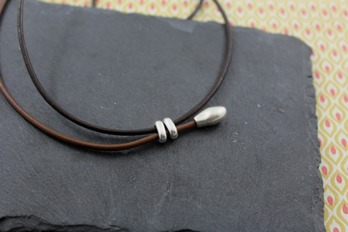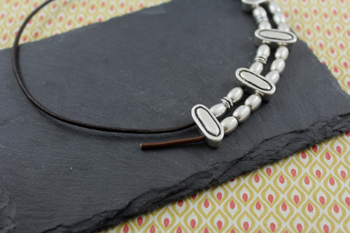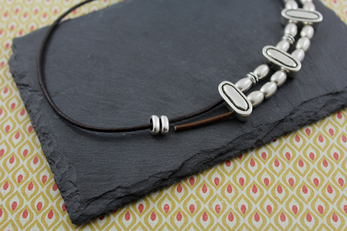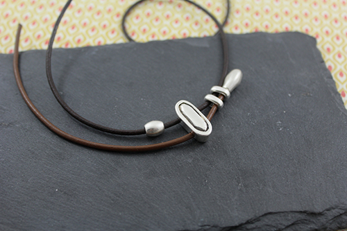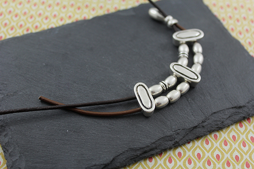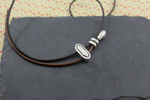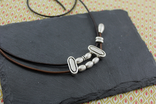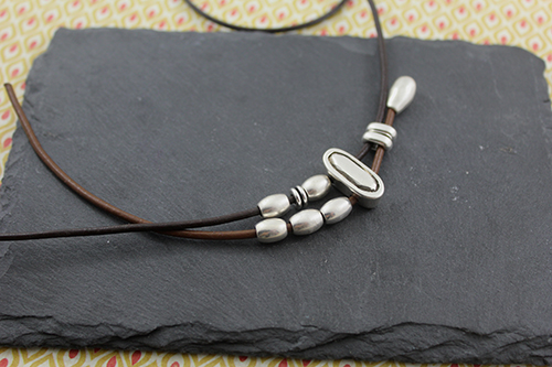 Abalorios: 15 pasadores barriles medianos , 4 pasadores zamak ovalado de 19 x 8 mm con baño de plata y 2 taladros de 3 mm , 4 pasadores anilla ovalada de zamak con taladro de 3 x 5 mm , 3 pasadores doble anilla de zamak , cuero de 2 mm marrón (50 cm para el cordón largo) , cuero 2 mm marrón claro (15 cm para el cordón pequeño) , 2 terminales lágrima pequeños y cierre fleje paso 2 mm.