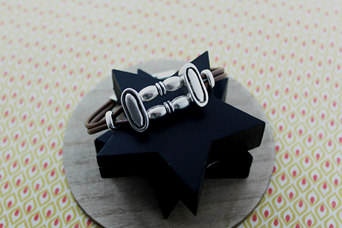 Abalorios: 4 pasadores barriles medianos , 2 pasadores zamak ovalado de 19 x 8 mm con baño de plata y 2 taladros de 3 mm , 2 pasadores anilla ovalada de zamak con taladro de 3 x 5 mm , 2 pasadores doble anilla de zamak , cuero 2 mm marrón claro (unos 15 - 18 cms) , y cierre fleje paso 3 mm.