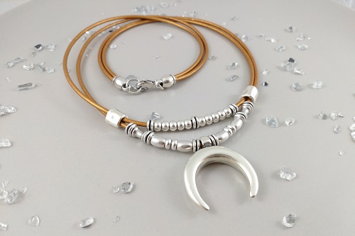 Componentes: Cordón cuero 2 mm bronce, Pasador tubo irregular 7 mm, Pasador doble anilla, Bolas 5 mm con taladro 2.6 mm, Pasador cóncavo, Pasador barril pequeño, Pasador doble bola, Colgante cuerno doble. Para el cierre: Terminal de 3.5 mm con anilla, Mosquetón de 12 mm, Anilla de 6 y 8 mm.