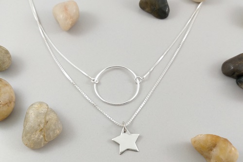 Componentes: Cadena plata veneciana abierta con 2 anillas, Entrepieza plata aro 20 mm, Gargantilla plata veneciana 45 mm, Charm plata estrella, Anilla plata redonda 6 mm hilo 0.8 mm.