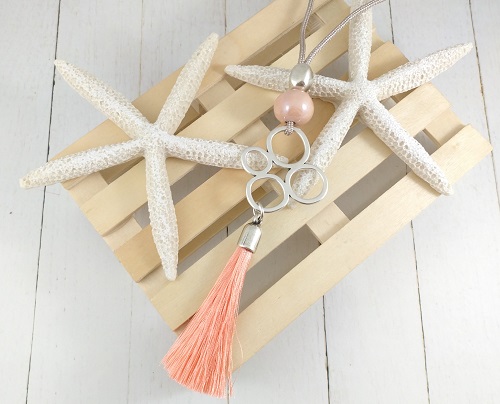 Componentes: Cordón paracord 2.5 mm beige liso, Pepita de zamak irregular, Bola cerámica color melocotón, Colgante cuatro círculos (NOVEDAD), Anilla 8 mm, Terminal campana 7 mm, Borla de seda color salmón