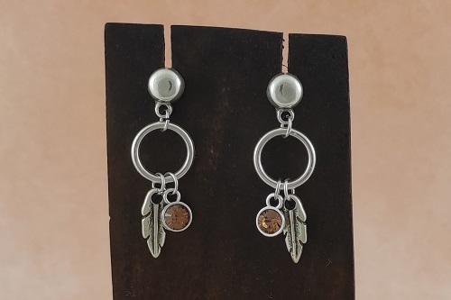 Materiales: Pendientes redondos con anilla - Colgante círculo 13 mm. - Colgante SS24 con swarovski light smoked topaz - Colgante hoja 15 mm. - Anillas 5 mm.