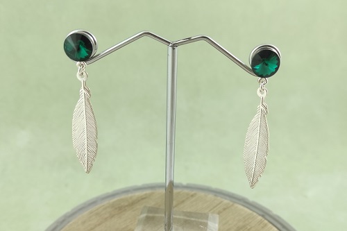 Materiales: Pendiente cono de plata con anilla con rivoli de 8 mm. color emerald - Colgante plata pluma de 33 mm. - Anilla plata redonda 3 mm. hilo 0.8 mm.
