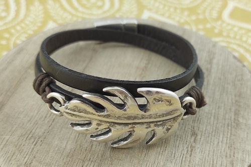 Materiales: Cuero plano 5 mm. marrón - Cierre imán 6 mm. - Entrepieza hoja con doble anilla - Cordón algodón encerado 1 mm. marrón