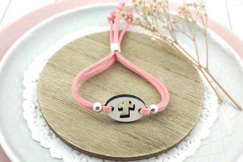 Materiales: Entrepieza ovalada madera con taladro cruz - 2 bolas 6 mm con taladro 3 mm - 1 pasador tubo irregular 7 mm - Antelina 3 mm rosa