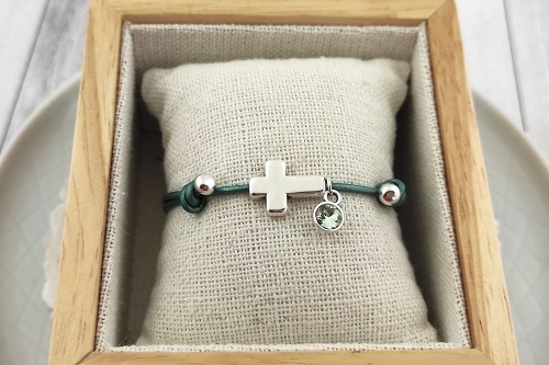 Materiales: Pasador cruz 16 x 12 mm. - Colgante con swarovski SS24 chrisolite - Cordón cuero 1.5 mm verde agua - 2 terminales redondos de 5 con taladro 2.2 mm - Anilla 5.5 mm