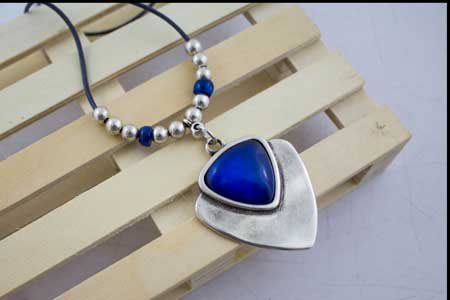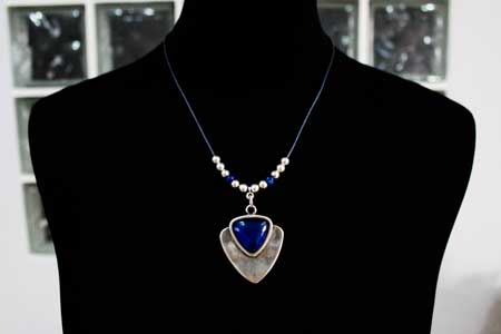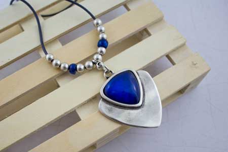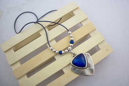 Abalorios: pasador bola con anilla , cuero 1,5 mm , colgante flecha con piedra azul , bolas 6 mm taladro 2 mm , donut 7 mm taladro 2,5 mm y terminal con mosquetón de 2 mm.
