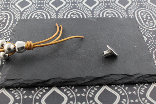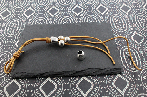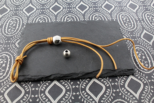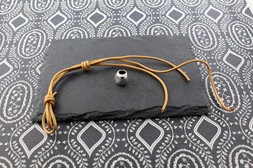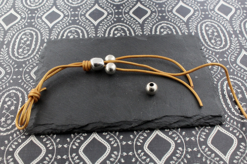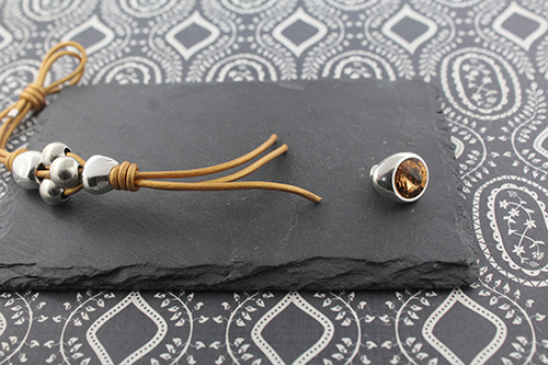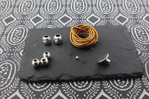 Terminal tubo 3 mm taladro 2,2 mm2  intermedios pepita de zamak , 3 bolas de 10 mm taladro de 3,5 mm , 1 metro de cuero de 2 mm y un terminal botón o un terminal botón con rivoli lo dejamos a tu elección.