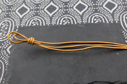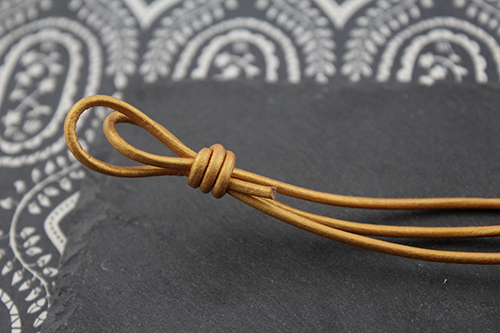 Corta el metro de cuero en dos partes, uno de 60 cm y otro de 40 cm. Coge el trozo de 60 cm y dóblalo por la mitad formando un ojal. Después dobla el trozo de 40 cm formando el mismo ojal que antes, pero esta vez en lugar de hacerlo de manera simétrica deja un lado más corto que otro. Ahora tendrás un ojal y 3 cabos de cuero, dos de ellos iguales y uno más largo. Una vez que lo tengas, con el cabo más largo de los 3, haz un nudo simple. nudo pulsera cuero abalorios la fermina zamak plata bisuteria estructura nudo-inicial-pulsera-cuero-abalorios-la-fermina-zamak-plata-bisuteria nudo inicial pulsera cuero abalorios la fermina zamak plata bisuteria