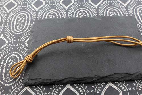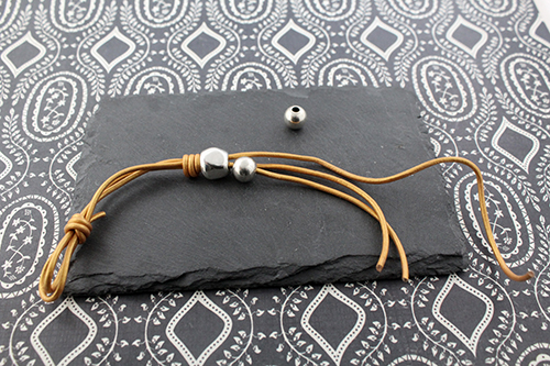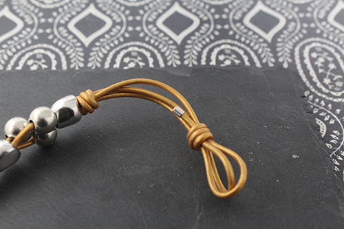 Una vez hecho el primer nudo para formar el ojal y el comienzo de la pulsera, mediremos 5 cm y realizaremos otro nudo simple como en el paso anterior, con el cabo más largo hacemos el nudo. segundo nudo-pulsera-cuero-abalorios-la-fermina-zamak-plata-bisuteria