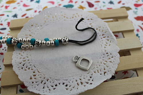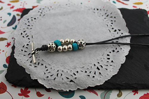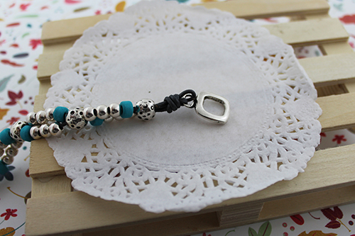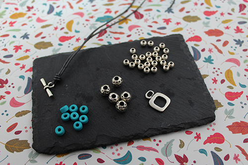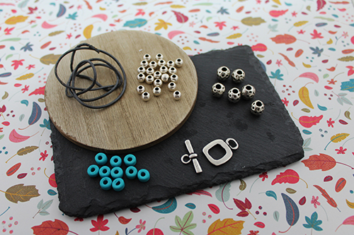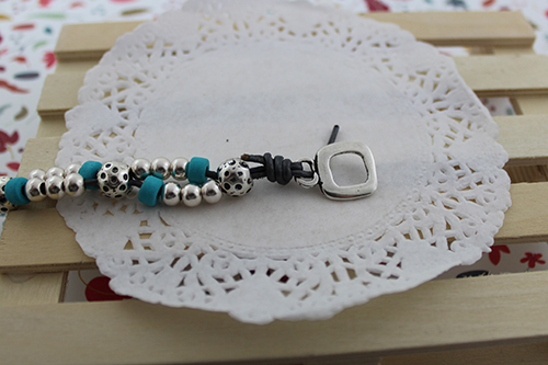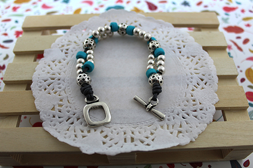 Cuero de 1,5 mm (unos 70-75 cm dependiendo de la muñeca), donuts de cerámica 6 mm taladro 2,3 mm, cierre aro cuadrado con barrita, 30 bolas de 6 mm taladro 2,4 mm y 6 bolas mart illadas 9 mm.