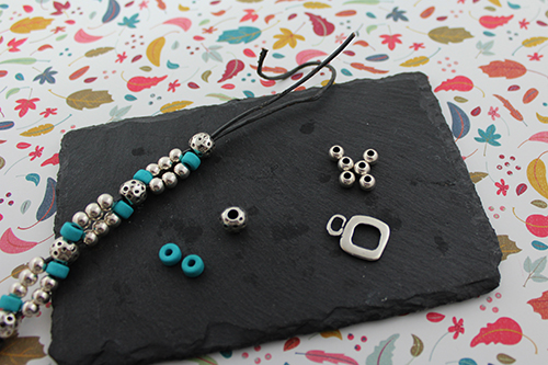 Una vez que tengas hecho el nudo en el cierre comienza a colocar las bolas. Primero coloca una bola martillada, después en uno de los cordones coloca un donut de cerámica de color y a continuación 3 bolas de 6 mm y taladro 2,4 mm y en el otro cordón mete las bolas en el orden inverso, primero las 3 bolas de 6 mm y taladro 2,4 mm y después el donut de cerámica. Para acabar el primer paso cierra la estructura con otra bola martillada.