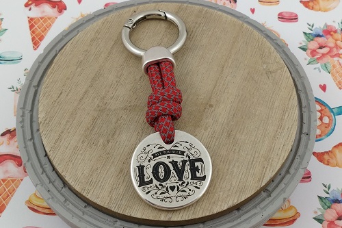 Componentes: Cordón paracord rojo con brillo 5 mm (NOVEDAD) - Chapa zamak redonda 20 mm. - Anilla 6 mm. - Pasador con anilla - Pasador tubo irregular 7 mm. - Terminal campana taladro 5 con anilla - Anilla de 6 mm. - anilla de 8 mm - mosquetón de 14 mm.
