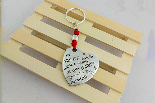 Abalorios: Anilla llavero, chapa zamak corazón grande, anilla 8 mm , terminal redondo de 3,5 mm, cola de ratón roja y pasador pepita de zamak irregular.