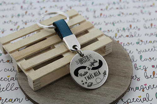 Abalorios: anilla llavero , chapa redonda de 35 mm , cuero plano turquesa 10 x 2 mm , terminal plano 10 x 5 mm y anilla ovalada 9 x 6 mm.