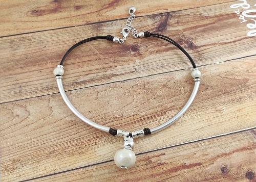 ¡La combinación de materiales en este collar corto es perfecta!. Unimos cerámica y cuero, materiales naturales, con el brillo y la luminosidad que nos aporta el zamak con baño de plata.